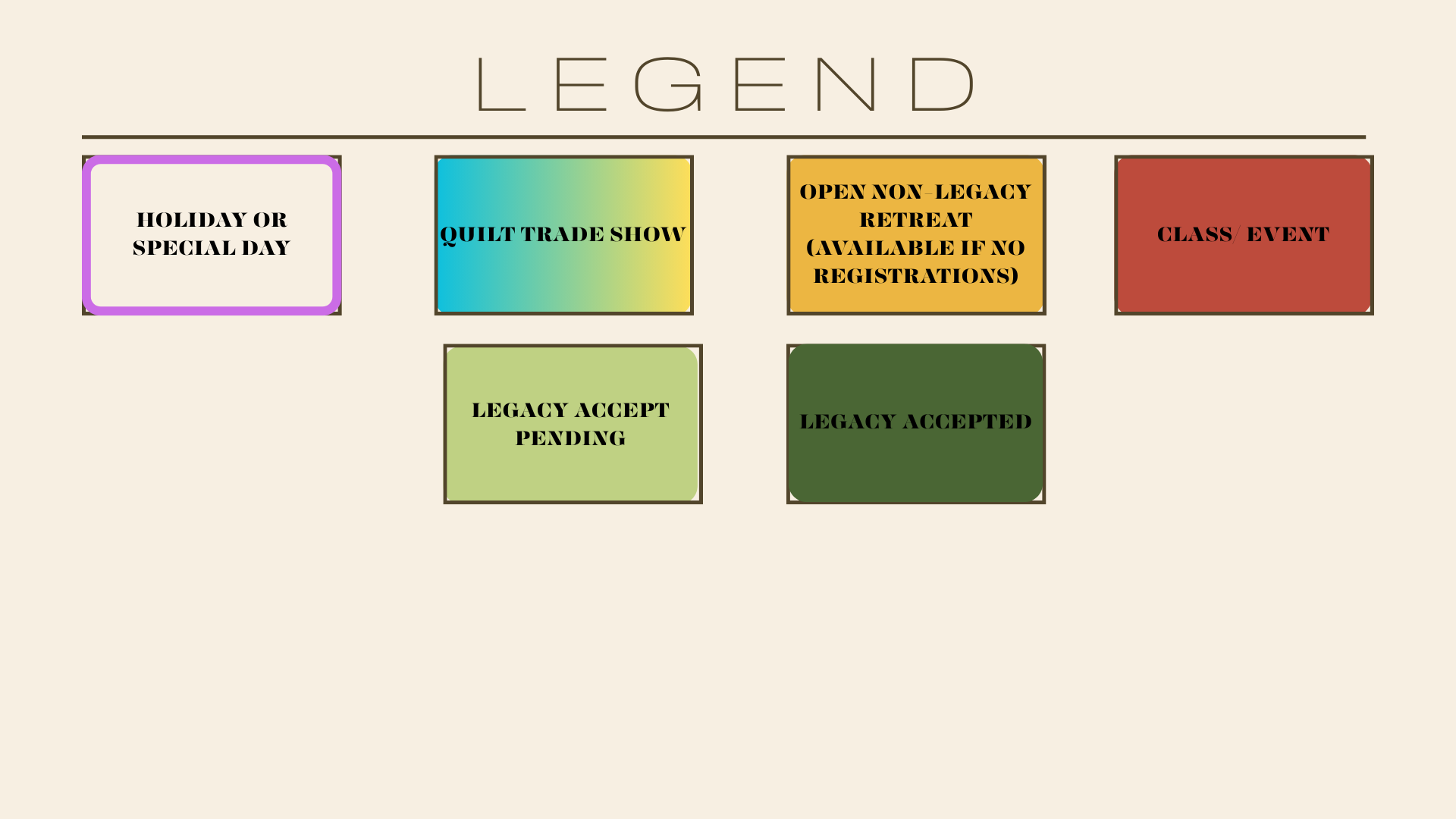 As groups confirm their participation in the Legacy Program, their weeks will become solidified, and the calendar color will change to reflect their official Legacy status.